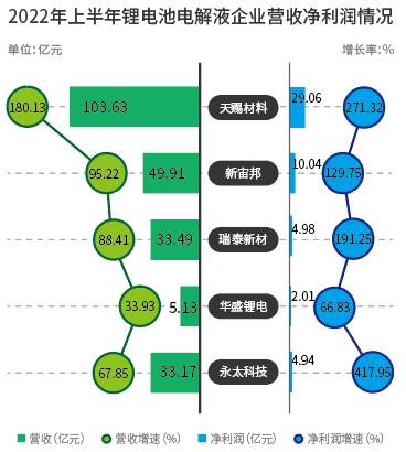 电解液添加剂企业中,华盛锂电营收5.13亿元,同比增长35.93%;净利润2.01亿元,同比增长66.83%。永太科技营收33.17亿元,同比增长67.85%;净利润4.94亿元,同比增长417.95%。