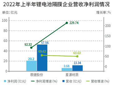 隔膜行业仍是恩捷股份、星源材质两巨头并立,这两家上市公司在营收、净利润增速以及毛利率水平方面与同行其它上市公司拉开较大差距。恩捷股份营收达57.56亿元,同比增长69.62%;净利润20.20亿元,同比增长92.32%,其膜类产品毛利率达52.03%。星源材质营收达13.34亿元,同比增长60.63%;净利润3.68亿元,同比增长229.74%,其隔膜产品毛利率达47.01%。
