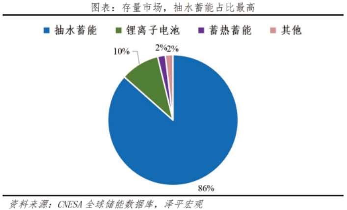 抽水蓄能,是利用水作为储能介质,通过电能与势能相互转化,实现电能的储存和管理。用电低谷时,利用过剩电力,将水从低标高水库抽到高标高水库;在电网峰荷时,高标高水库放水,回流至低标高水库,推动水轮发电机释放电能。具体看,抽水蓄能是当前技术最为成熟、最具经济性的储能方式,适用于大规模调峰与长时间调频。抽水蓄能主要围绕电网公司展开,受地理环境制约较大、建设周期较长。