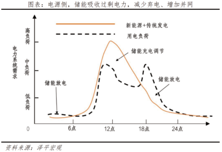 在电源侧,储能系统将是电源调峰、削峰填谷的重要抓手,成为“清洁电量的搬运工”。未来一段时间,我国电力供应结构仍将以燃煤发电为主,“传统+新能源”混合发电模式并行。在用电低谷时,燃煤机组可进行灵活性调节,整体发电降至最小出力限制附近。但如果此时的发电供给仍高于电力需求,则传统能源端无法进一步调节,只能从新能源端选择弃光、弃风。储能系统加入后,弹性调度、源网荷储互动成为可能。在风电、光伏的发电高峰时段内,储能系统“充电”,消纳新能源电量,有效降低弃光率;在无风、无光时,储能系统“放电”,支撑电力系统正常运行。