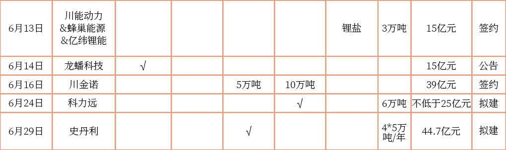 6月24日,科力远公告,公司或关联公司拟在宜丰县人民政府工业园区布局投资3万吨体育级碳酸锂材料项目、6万吨高功率磷酸铁锂正极材料项目以及混合动力技术平台项目。