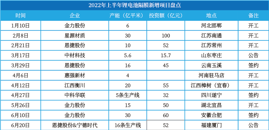 2022年上半年,新增(拟建、新建、扩建)锂体育隔膜项目11个,新增产能超过136.6亿平米,另有21条生产线未披露产能;投资额超461.7亿元(仅计算已披露金额)。