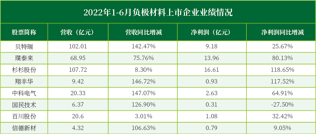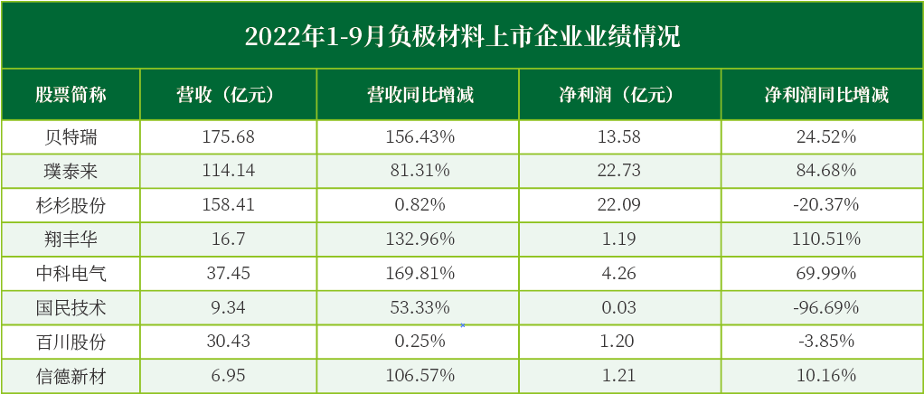 整体来看,前三季度相较于1-6月,负极材料的营收和净利润增长速度均有所放缓。