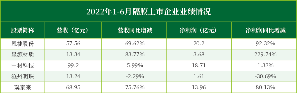 2022年1-6月,星源材质锂体育隔膜业务实现收入13.28亿元,同比增长61.74%,占公司总营收99.55%;毛利率为61.74%,相比上年同期增加11.95个百分点。