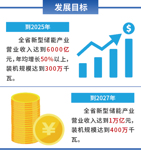《指导意见》第一部分为总体要求,主要包括指导思想和发展目标,提出到2025年,实现新型储能产业链关键材料、核心技术和装备自主可控水平大幅提升,全产业链竞争优势进一步凸显,市场机制、标准体系和管理体制更加健全,大型骨干企业规模实力不断壮大,产业创新力和综合竞争力大幅提升等发展目标,全省新型储能产业营业收入达到6000亿元,年均增长50%以上,装机规模达到300万千瓦。到2027年,全省新型储能产业营业收入达到1万亿元,装机规模达到400万千瓦。
