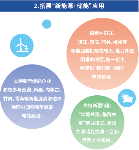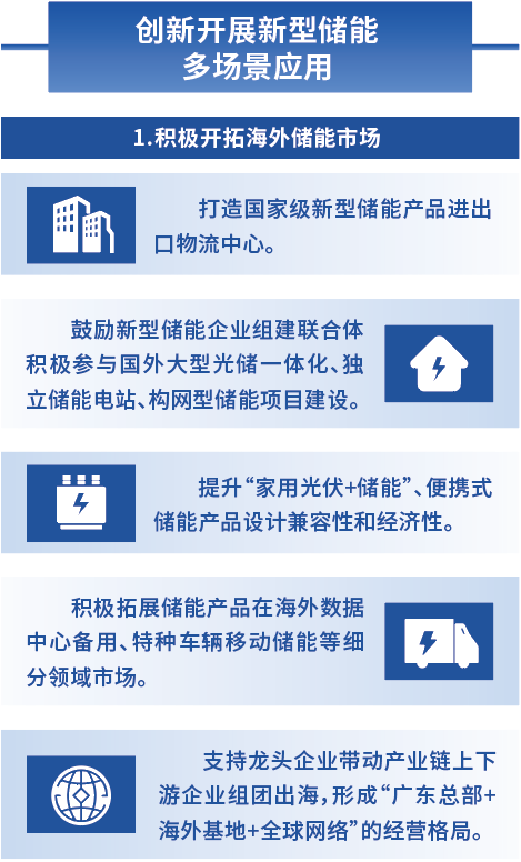 三是创新开展新型储能多场景应用。针对广东省新型储能装机市场有待拓展等问题,提出积极开拓海外储能市场、拓展“新能源+储能”应用、推进定制化应用场景、推进虚拟电厂建设、鼓励充换电模式创新等7条政策措施。