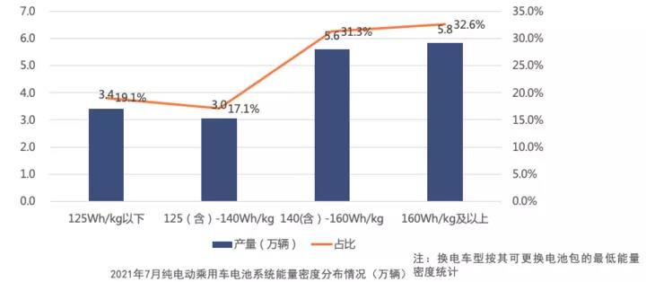 2021年7月,我国纯电动乘用车系统能量密度在140(含)-160Wh/kg与160Wh/kg及以上车型产量占比分别为31.3%和32.6%,装车体育系统能量密度最高达201Wh/kg。125Wh/kg以下和125(含)-140Wh/kg车型产量占比分别为19.1%和17.1%。