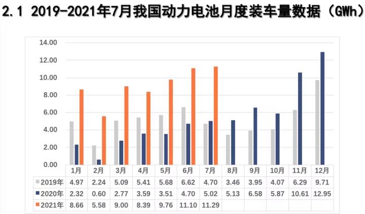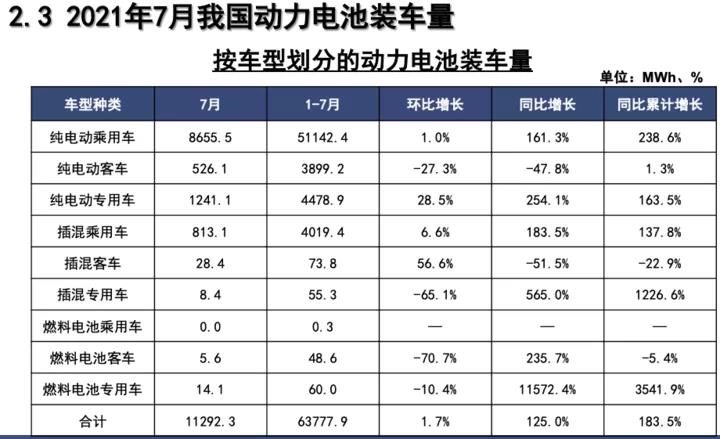 2021年7月,我国新能源汽车按车型划分的平均装车电量46.9kWh,环比下降1.5%。其中纯电动乘用车和纯电动客车单车平均带电量分别为48.4kWh/辆和207.0kWh/辆,纯电动客车单车平均带电量环比下降2.3%。