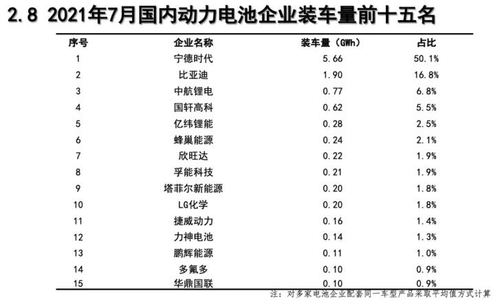 7月,宁德时代装车量5.66GWh,占比达50.1%,继续霸榜;比亚迪装车量1.9GWh,占比达16.8%,位居第二;中航锂电装车量0.77GWh,占比6.8%,超越LG化学,跻身第三。