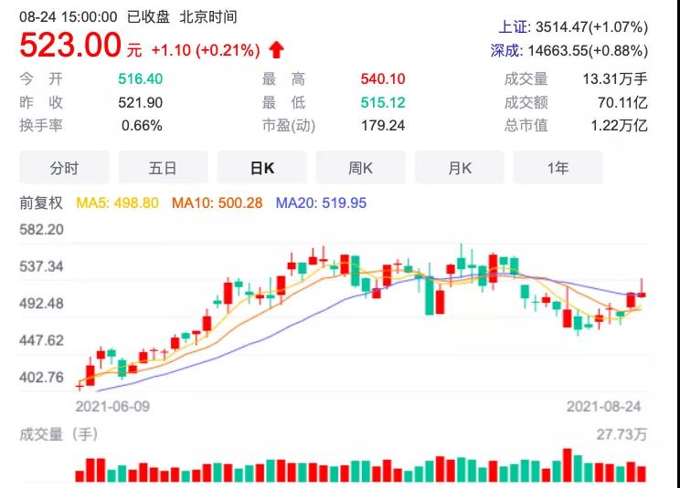 截止目前,宁德时代的报价为523元/股,总市值为1.22万亿元。