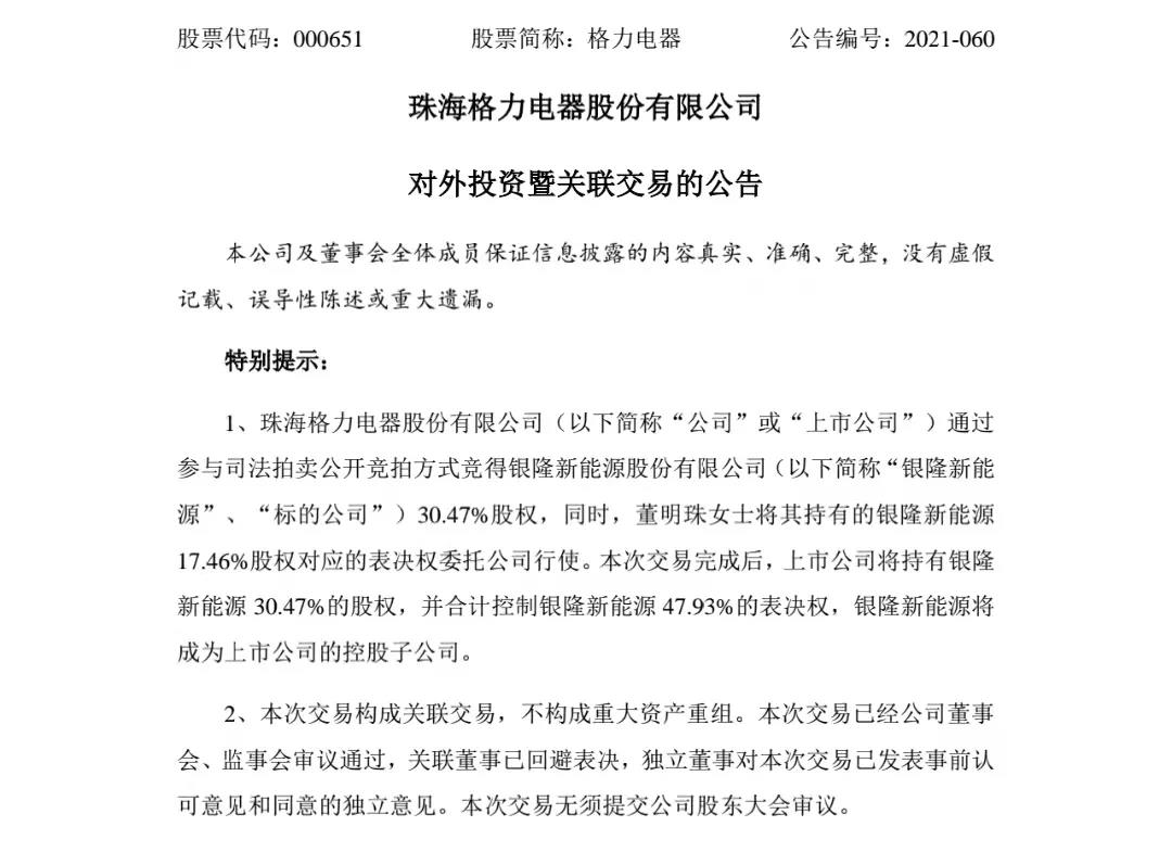 格力电器公告,公司于8月31日参与了银隆新能源的司法拍卖,以18.28亿元的价格竞得银隆新能源3.36亿股股份;并与董明珠签订了附生效条件的表决权委托协议,董明珠将其持有的银隆新能源1.93亿股股份对应的表决权委托公司行使。