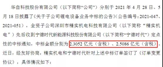 公告显示,精实机电分别于今年4月28日、5月18日披露了《关于子公司锂电设备业务中标的公告》,其先后收到宁德时代定点性的中标通知,中标金额分别为2.3052亿元(含税)、2.5086亿元(含税)。