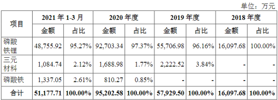 从业务结构来看,2018-2020年、2021年1-3月,湖南裕能主营业务收入以磷酸铁锂产品收入为主,占公司主营业务收入比例分别为100.00%、96.16%、97.37%和95.27%。