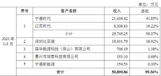 客户方面,2018年至2021年第一季度,湖南裕能对前五大客户的销售收入,占整体销售收入的比重均超过95%。其中,公司对宁德时代、比亚迪的合计销售收入占比,分别达91.24%、93.56%、91.10%和96.99%,客户集中度较高。