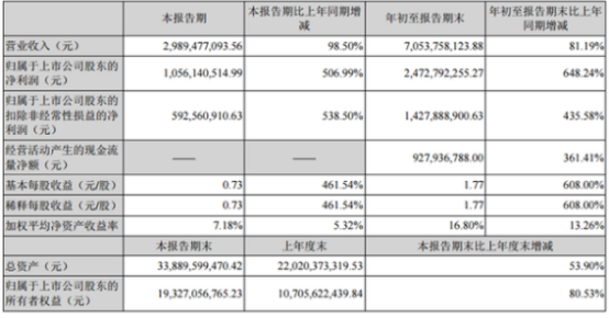 单季度来看,第三季度公司营收加速上涨,实现营业收入29.89亿元,同比增长98.50%;归母净利润为10.56亿元,同比增长506.99%。