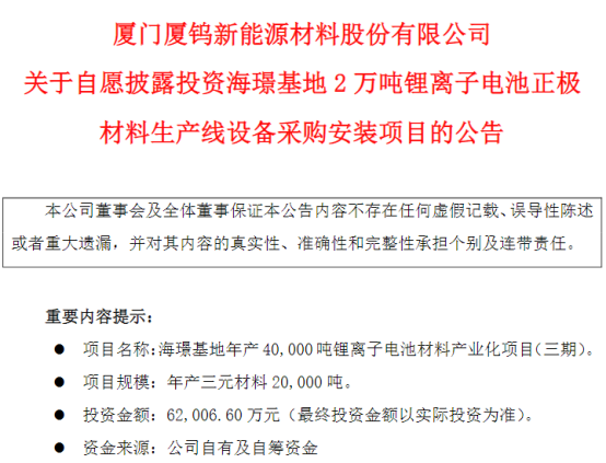 此外,登陆科创板一个多月后,厦钨新能抛出了百亿级扩产的大手笔。9月16日晚,厦钨新能公告,公司计划在雅安经开区投资建设锂离子正极材料项目,预计投资意向不低于100亿元,拟投资建设10万吨磷酸铁锂、6万吨三元材料等。