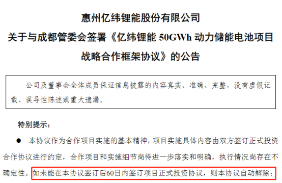 值得注意的是,公告指出,如未能在本协议签订后60日内签订项目正式投资协议,则本协议自动解除。