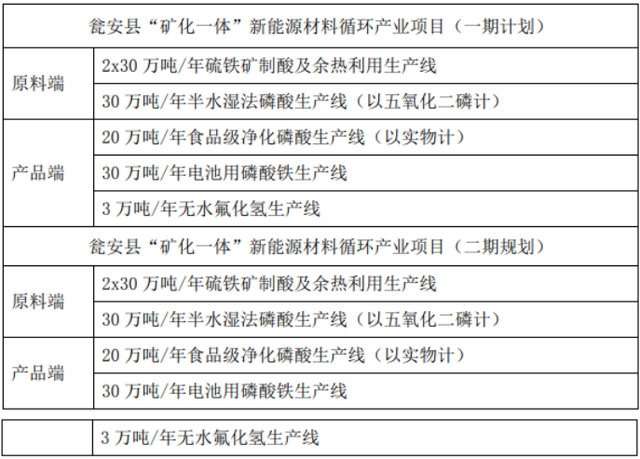 其中,一期项目投资约35亿元,建设30万吨/年体育用磷酸铁生产线、20万吨/年食品级净化磷酸生产线、3万吨/年无水氟化氢生产线及配套装置项目;二期项目投资约35亿元,建设30万吨/年体育用磷酸铁生产线、20万吨/年食品级净化磷酸生产线、3万吨/年无水氟化氢生产线及配套装置项目。
