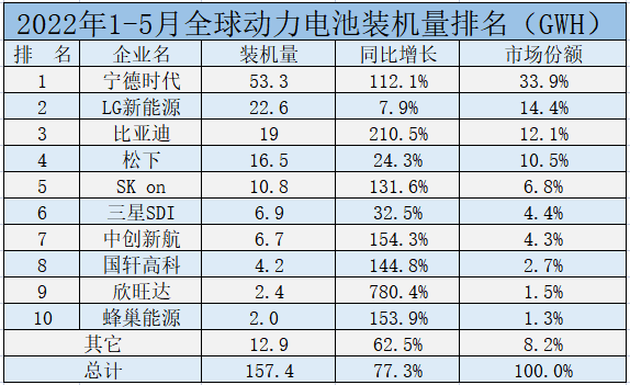 从1-5月全球动力体育装车量TOP10来看,宁德时代以53.3GWh的装车量继续霸居榜首,同比增长112.1%,市场份额达到33.9%;LG新能源以22.6GWh保持第二位,同比增长7.9%,市占率14.4%;比亚迪以同比增长210.5%、装车量19GWh的成绩排在第三,市场份额达12.1%;日本松下继续保持第四,装车量达16.5GWh,市场份额达10.5%;SK On装车量达10.8GWh,同比增长131.6%,但市场份额略有下降,至6.8%;三星SDI较1-4月排名上升一位,装车量6.9GWh,同比增长32.5%,市占率在4.4%;中创新航装车量6.7GWh,同比增长154.3%,市占率4.3%;国轩高科、欣旺达、蜂巢能源分别位列第八到第十位,市场份额分别占2.7%、1.5%、1.3%。