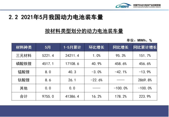 今年前5个月,我国动力体育装车量累计41. 4GWh,同比累计上升223.9%。其中三元体育装车量累计24.2GWh,占总装车量58.5%,同比累计上升151.7% ;磷酸铁锂体育装车量累计17.1GWh,占总装车量41.3%,同比累计上升456.6%。