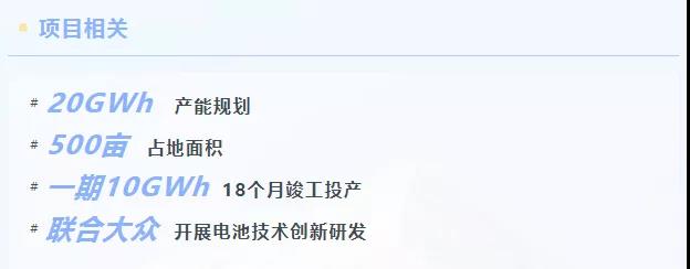 根据协议,合肥国轩将在合肥新站高新区内投资建设年产20GWh大众标准电芯项目,项目预计占地 500 亩。该项目将统一规划、分期实施,一期项目10GWh拟自开工之日起 18 个月后竣工投产。国轩与大众将联合开展体育技术创新研发,将新站高新区打造成全球新能源汽车动力体育产业的重要基地。