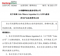 10月20日晚,有锂王之称的赣锋锂业(002460.SZ),发布了《关于收购LITIO MINERA ARGENTINA S.A.8.58%股权...
