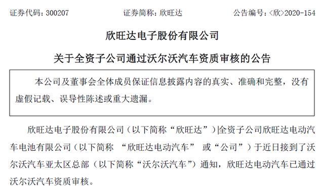 欣旺达电子股份有限公司(以下简称“欣旺达”)全资子公司欣旺达电动汽车体育有限公司(以下简称“欣旺达电动汽车”)于近日接到了沃尔沃汽车亚太地区总部(以下简称“沃尔沃汽车”)通知,欣旺达电动汽车已通过沃尔沃汽车资质审核。
