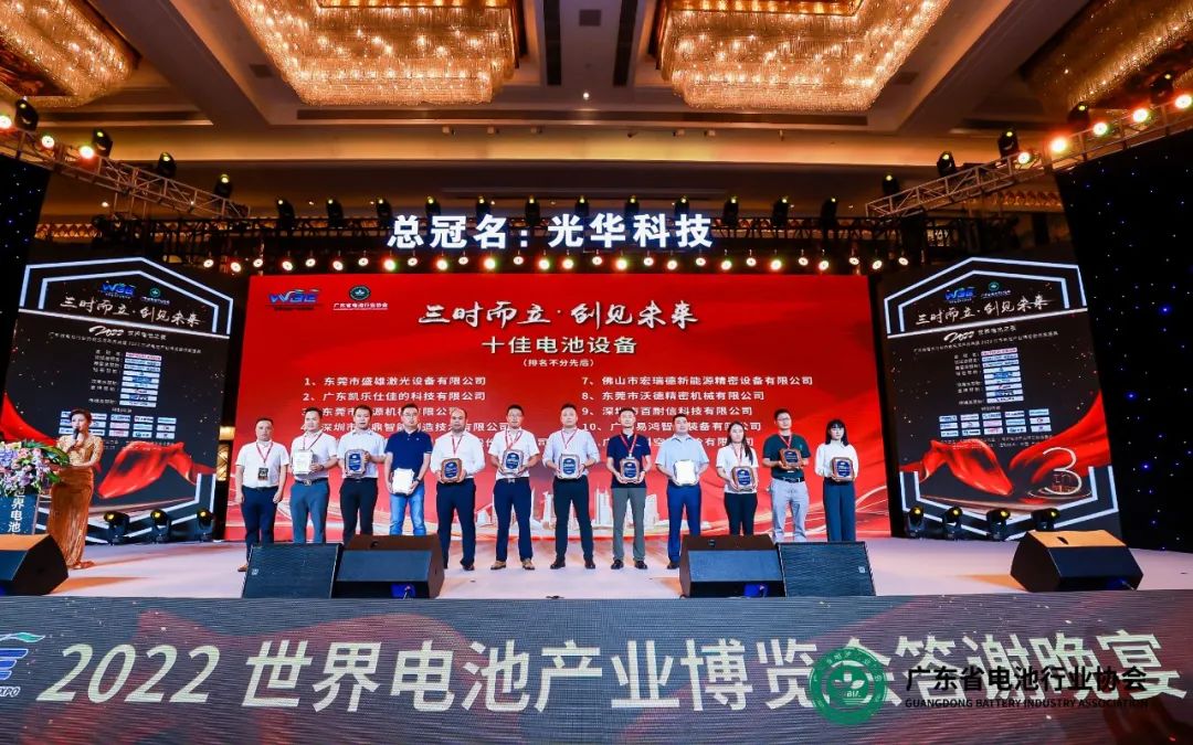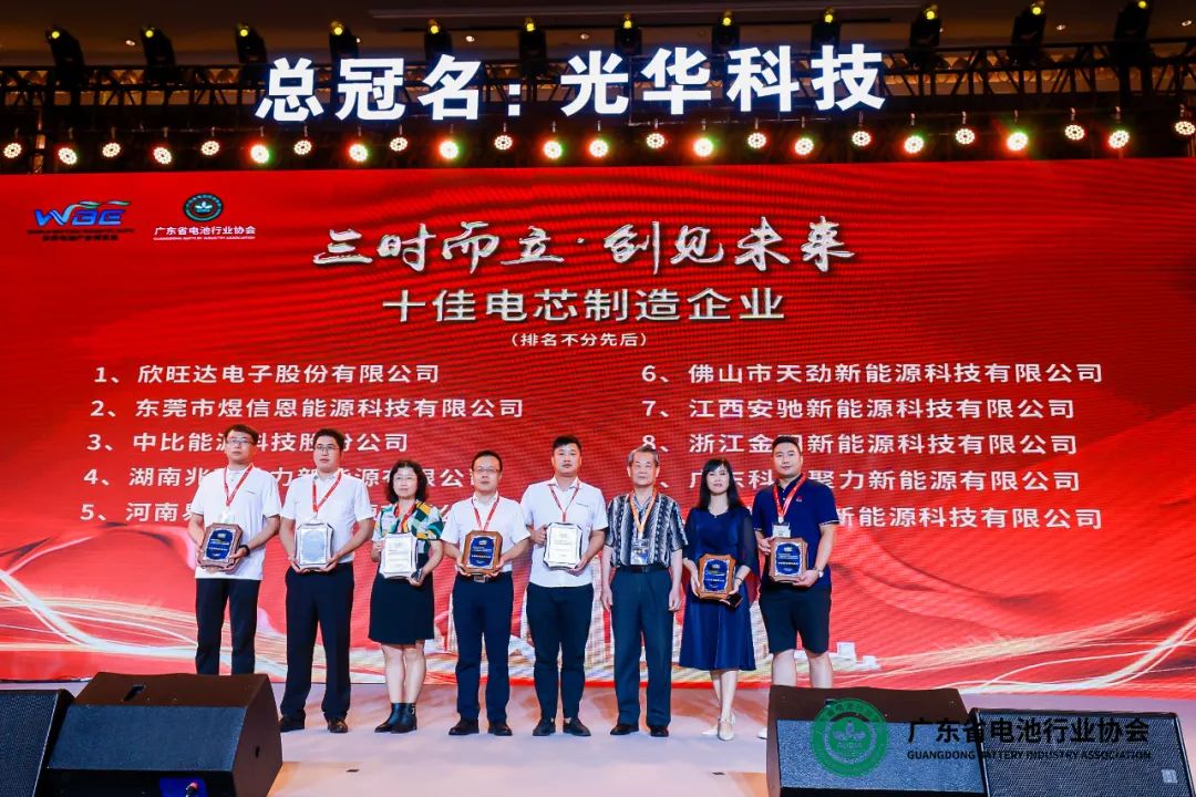 欣旺达、佛山天劲、德晋新能源等10家企业被评为世界体育产业博览会十佳体育制造企业;路华集团董事长陈步霄为十佳电芯制造企业颁奖。