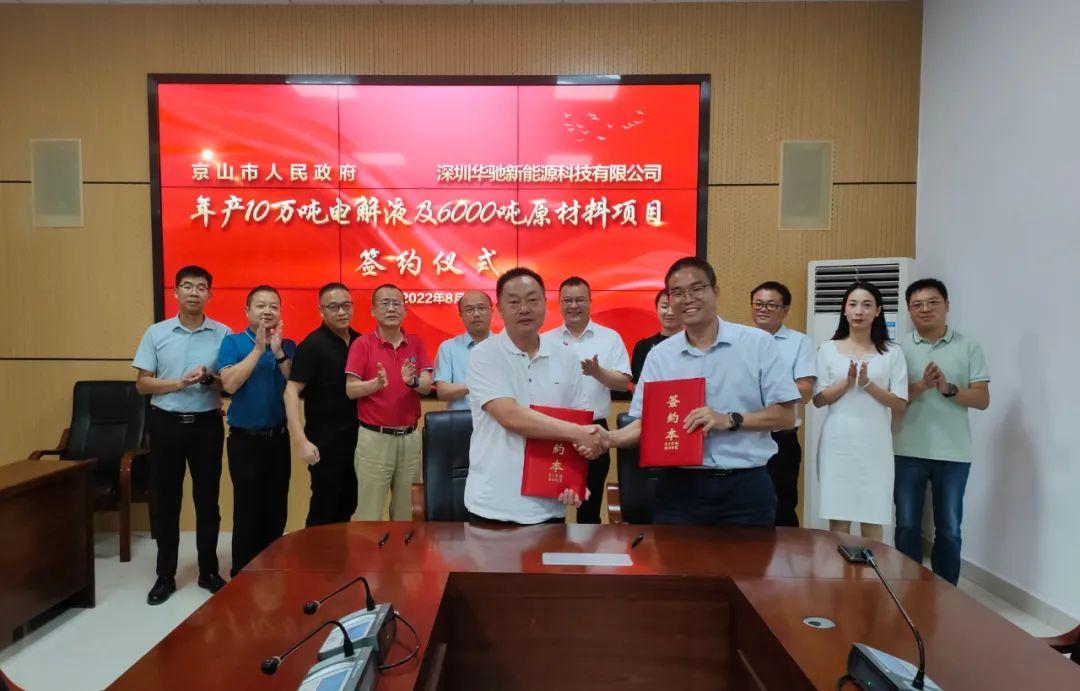 8月18日,湖北省京山市人民政府和东莞华驰新能源科技有限公司在京山举行“年产10万吨电解液及6000吨原材料项目”签约仪式。