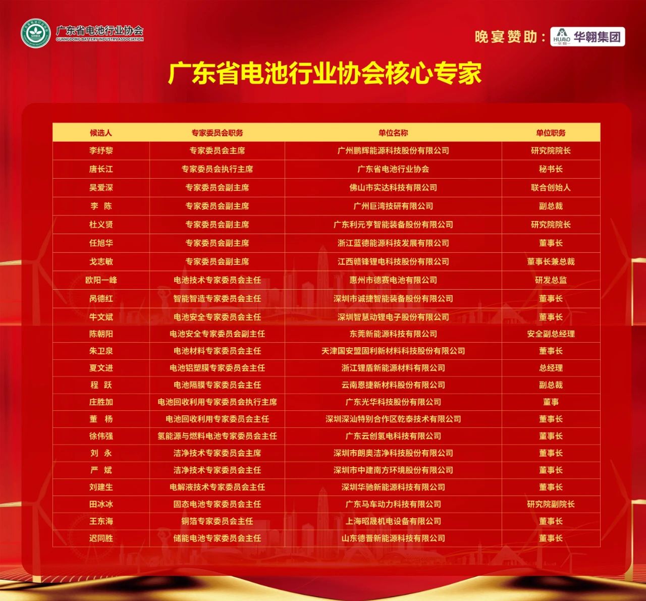 专家委员会全体专家推选鹏辉能源研究院院长李纾黎为专家委员会主席;推选意昂5协会唐长江秘书长为专家委员会执行主席;推选佛山实达常务副总吴爱深、巨湾技研副总裁李陈、利元亨研究院院长杜义贤、蓝德科技董事长任旭华、赣锋锂电董事长戈志敏等5人为专家委员会副主席。