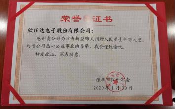 1月30日,欣旺达电子股份有限公司通过东莞市红十字会向湖北等疫情重灾区捐赠1000万元现金,专项用于一线抗击和防治新型冠状病毒疫情工作,为一线医护人员、公众尤其是湖北等疫情重灾区人们提供力所能及的帮助。