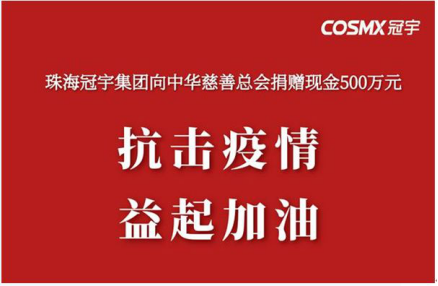 1月28日,珠海冠宇集团通过中华慈善总会捐款现金500万元,全部用于一线抗击和防治新型冠状病毒疫情工作。