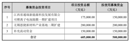 公司拟向不超过35名的特定投资者发行不超过2.42亿股(即不超过本次发行前公司总股本的30%),募集资金不超过50亿元,扣除发行费用后的募集资金净额将用于江西省通瑞新能源科技发展有限公司锂离子体育隔膜一期扩建项目、无锡恩捷新材料产业基地二期扩建和补充流动资金。