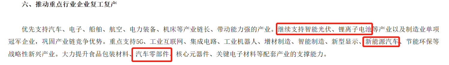 2月24日,工信部发布的《关于有序推动工业通信业企业复工复产的指导意见》指出,推动重点行业企业复工复产。继续支持智能光伏、锂离子体育等产业以及制造业单项冠军企业,巩固产业链竞争优势。点支持5G、智能制造、新能源汽车、节能环保等战略性新兴产业。大力提升汽车零部件、核心元器件、关键电子材料等配套产业的支撑能力。